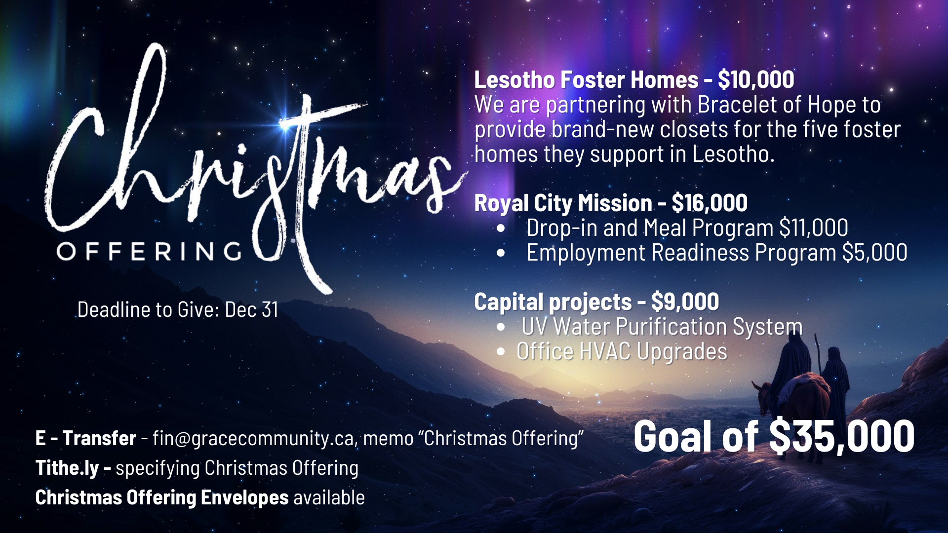 Because of your generosity, we surpassed our $25,000 goal last year and blessed our partners in Quito, Ecuador with a new ministry van, something that will impact their church and community for years to come. It meant so much to be able to come alongside them in this way. Click the poster below to discover the heart behind this year’s offering or head to www.gracecommunity.ca/christmasoffering.