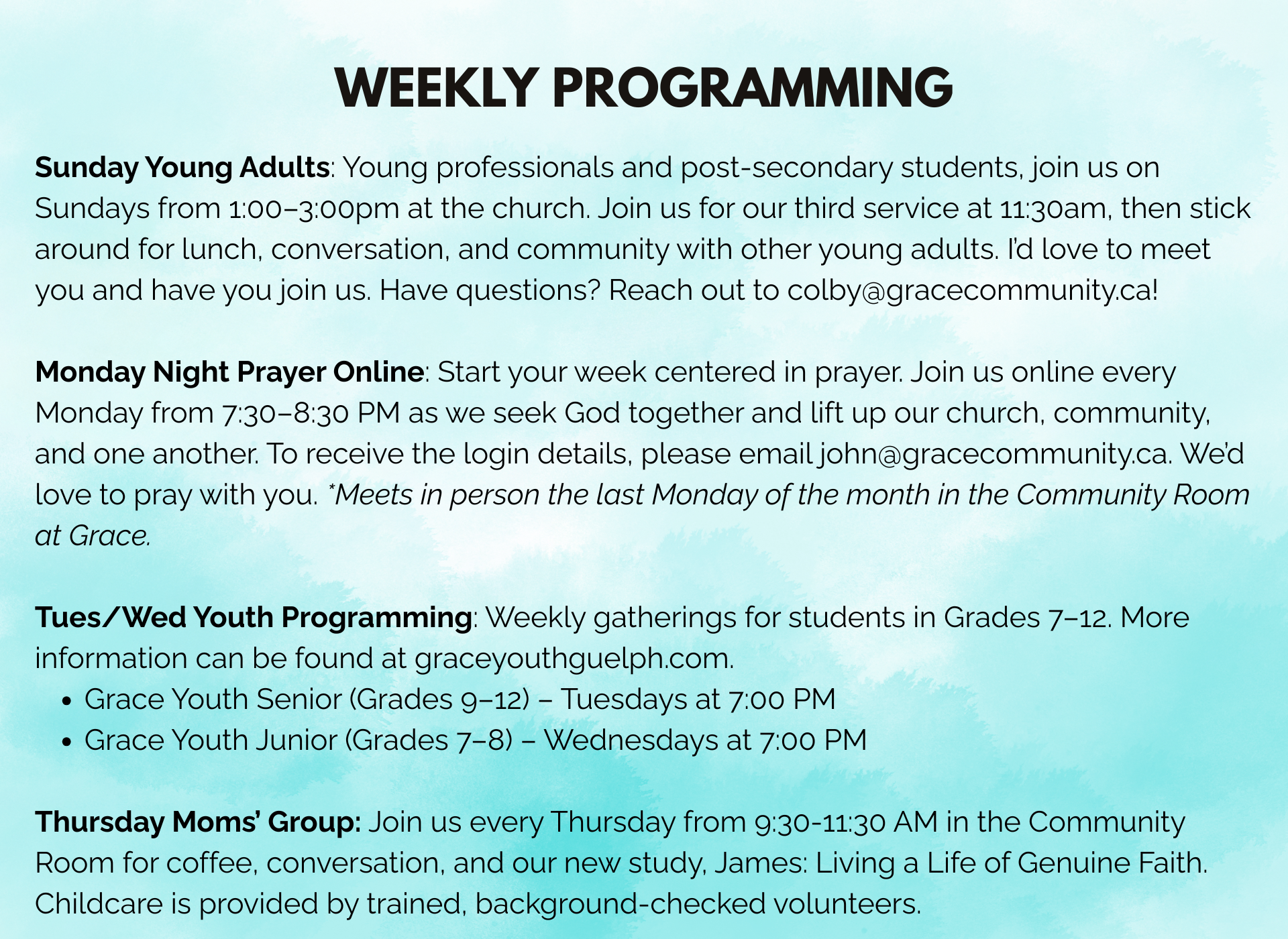 Head over to @gracecommunityguelph to see what we are up to! Even if you don’t have an Instagram account you can click the link above to access our page @gracecommunityguelph